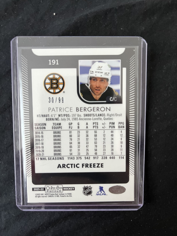 21-22 O pee Chee platinum Patrice Bergeron arctic freeze /99