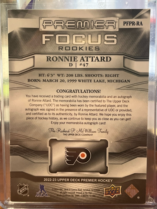 22/23 2022 UPPER DECK PREMIER RONNIE ATTARD PFPR-RA FOCUS ROOKIES AUTO PATCH 53/125