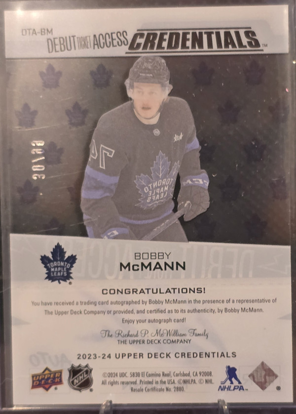 23-24 Credentials Debut Ticket Acetate Auto Bobby McMann /99