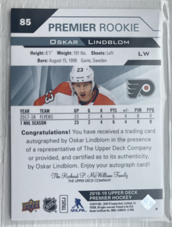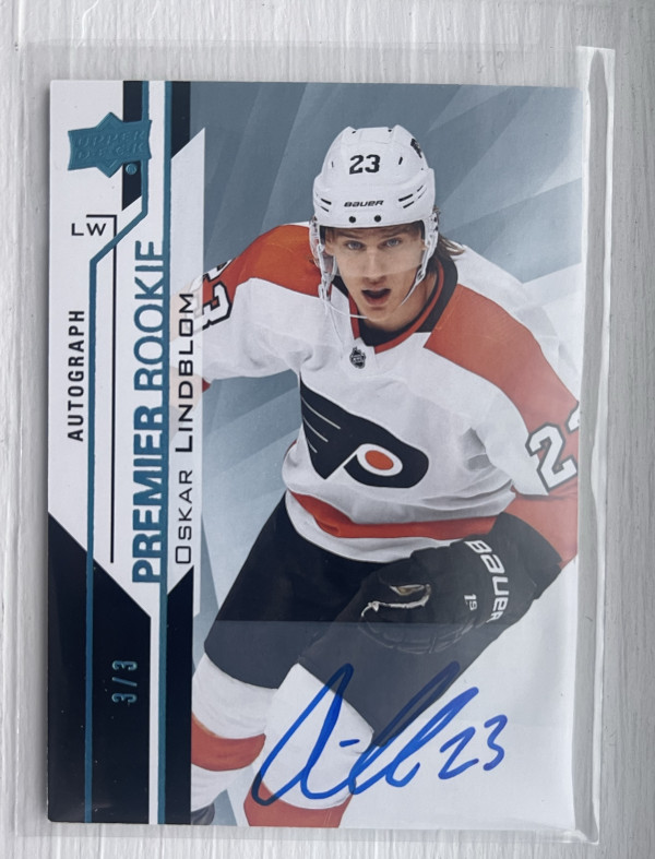 3 Of 3 RARE Oskar Lindblom 2018-19 Upper Deck Premier Rookie Autograph #85 Philadelphia Flyers