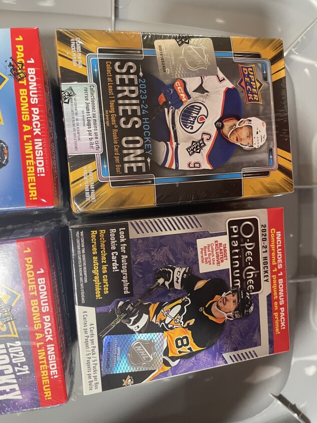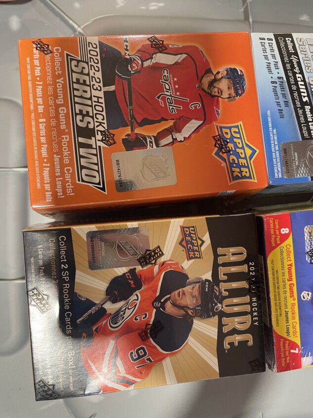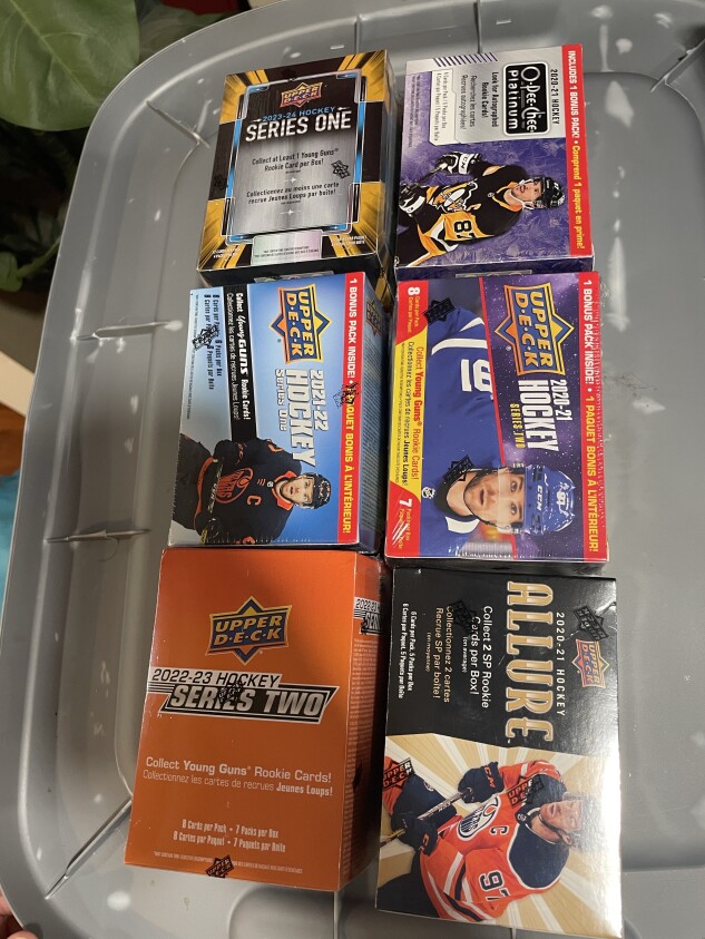 Everything you see is factory sealed. 2023-24 Upper Deck Series 1, 2021-21 O-Pee-Chee Platinum, 2021-22 Upper Deck Series 1, 2020-21 Upper Deck Series 2, 2022-23 Upper Deck Series 2, 2020-21 Allure