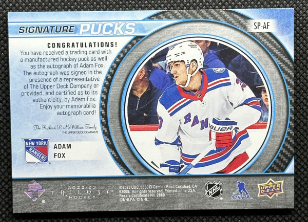 Adam Fox 22/23 UD Trilogy Signature Pucks SP-AF
