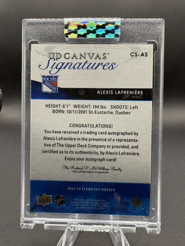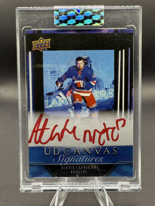 This Clear Cut of Alexis Lafreniere is the Red Ink version, I emailed UD to ask if this should have been a short print /13 due to the color and they said yes, but was sent out and won't be corrected. There are blue ink variations of this same card as well, but the red should be short print.