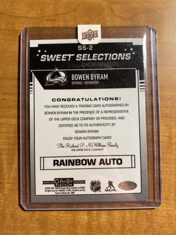 Bowen Byram 2020-21 O-Pee-Chee Platinum OPCP Sweet Selections Rookie Auto SSP Avalanche