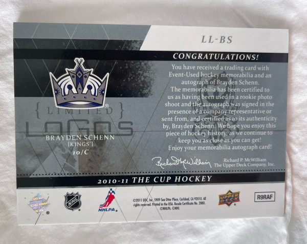 BRAYDEN SCHENN 2010-11 THR CUP Limited Logos Rookie #LL-BS /50 Auto Patch