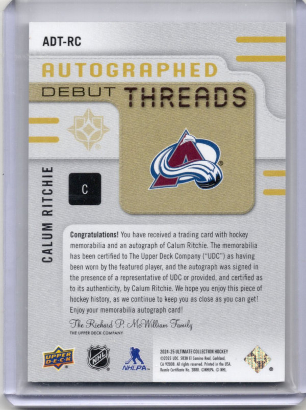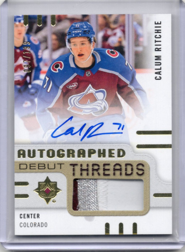 Calum Ritchie 2024-25 UD Ultimate Debut Threads Rookie Auto Patch 3-Color /199 #ADT-RC