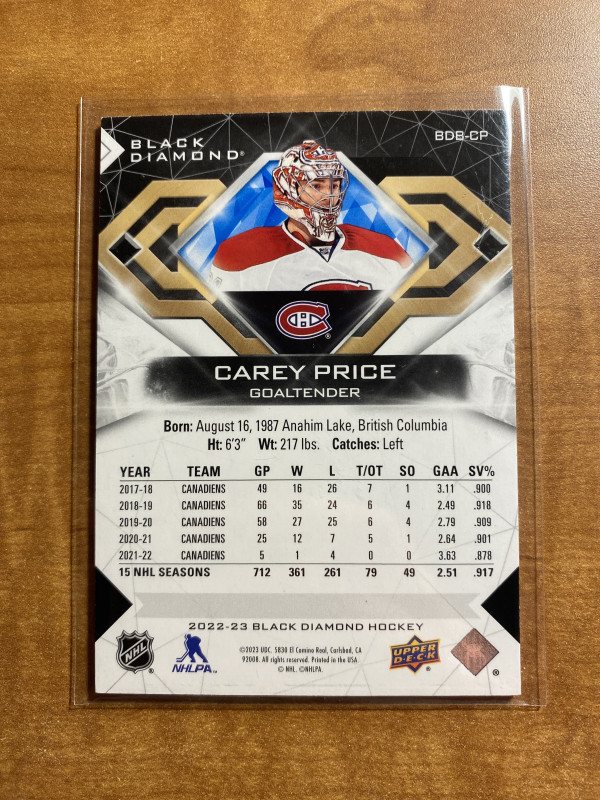 Carey Price 2022-23 UD Black Diamond Blue /25 Canadiens