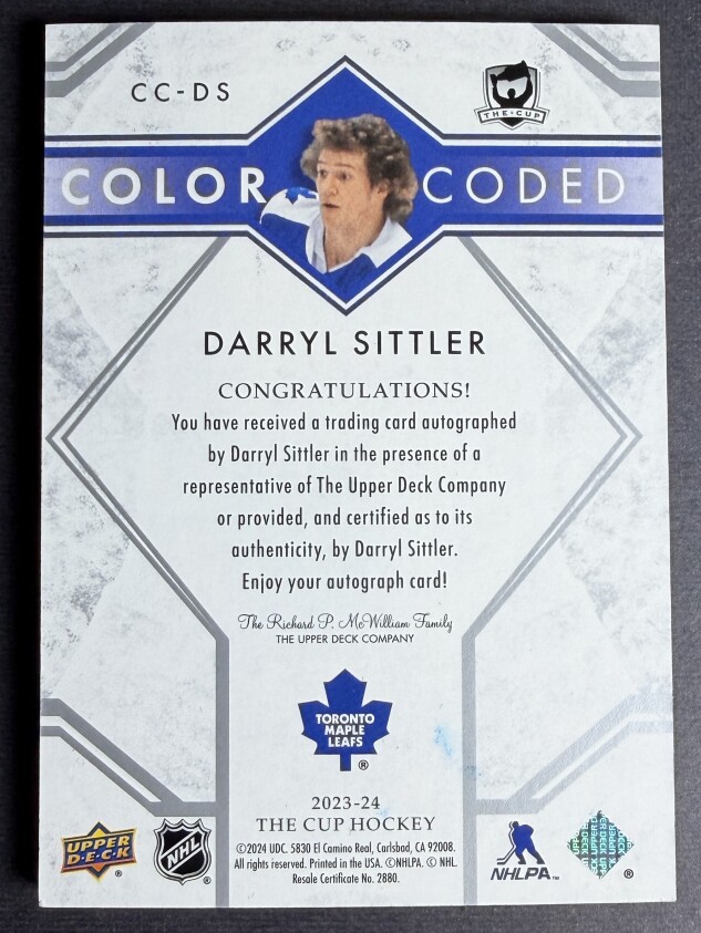 Darryl Sittler 2023-24 The Cup Color Coded Auto #CC-DS