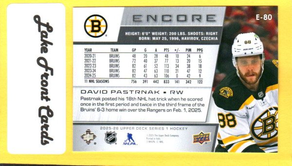 2025 Upper Deck Encore David Pastrnak #E-80 card featuring the Boston Bruins superstar winger. Clean Encore design showcasing one of the NHL’s elite goal scorers and a great addition for Bruins and Pastrnak collectors. Card shown is the exact card you’ll receive.