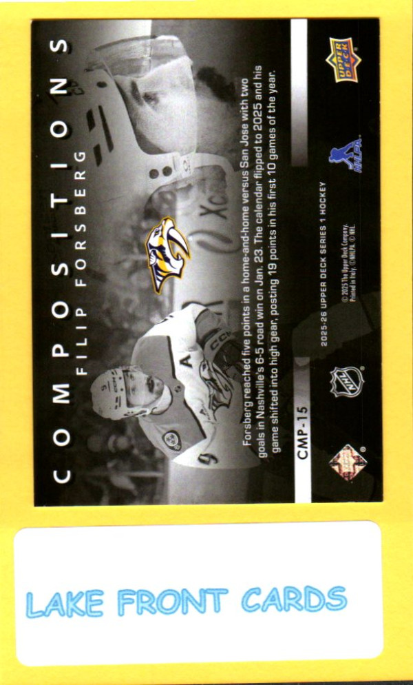 Up for sale is a Filip Forsberg #CMP-15 card from the 2025 Upper Deck Compositions insert set.