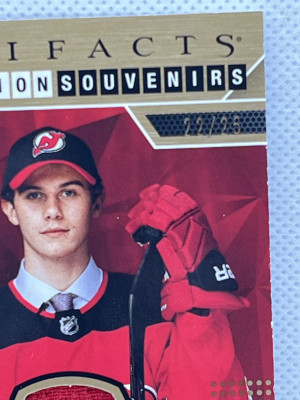 While technically not a rookie card, this short printed Selection Souvenirs features a 3 color patch swatch from Jack Hughes draft day jersey.