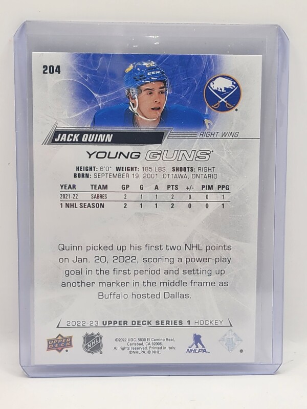 Thanks for your looking at my listing Jack Quinn 2022-23 Upper Deck Series 1 Hockey Young Guns RC #204. Let me know if you have any questions!
