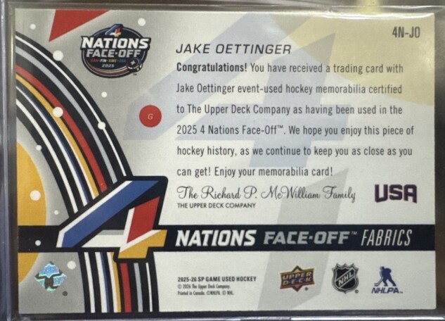JAKE OETTINGER TEAM USA 4 Nations Face Off Jersey Patch #4N-JO | 2025-26 SP Game Used