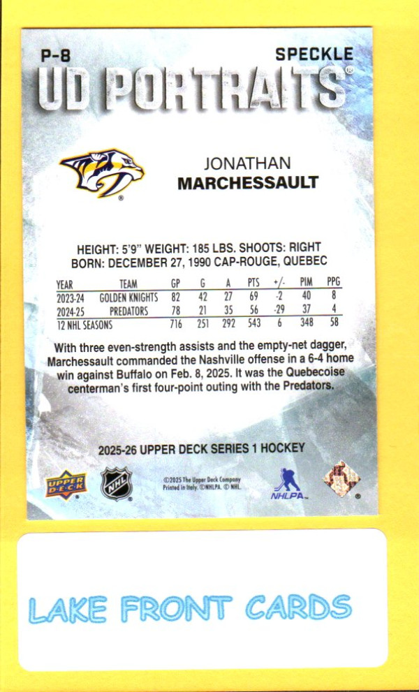Jonathan Marchessault [Speckle] #P-8 — 2025 Upper Deck UD Portraits Eye-catching Speckle parallel of Vegas’ star forward.