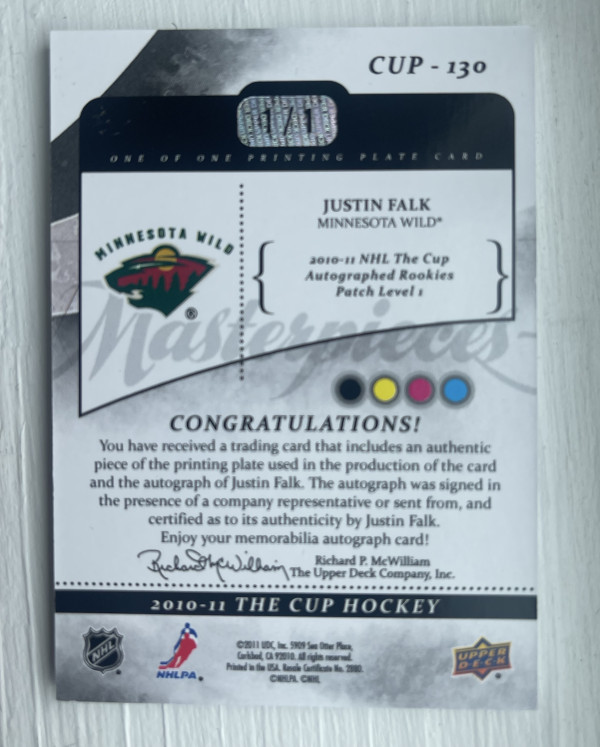 Justin Falk Magenta Plate 1/1 2010-11 The Cup Rookie Auto Upper Deck