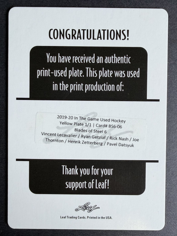 Lecavalier/Getzlaf/Nash/Thornton/Zetterberg/Datsyuk Leaf In The Game Used Hockey 1/1 Printing Plate #BS6-06