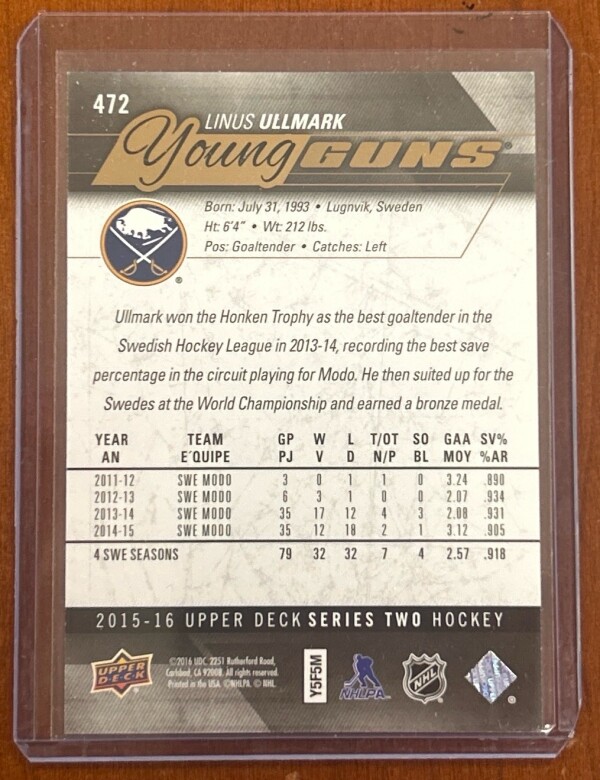 Linus Ullmark UD Exlusives Young Guns Rookie
