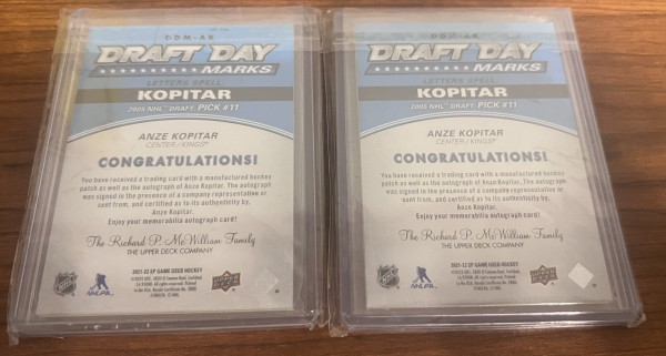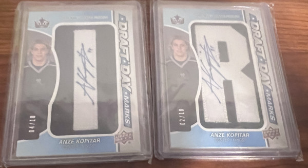 I have two Anze Kopitar Draft Day Marks cards. I am seeking a trade for the Anze Kopitar Draft Day Marks Letter "O" of either set, the 2015-16 or 2021-22. Yes, I am offering a lopsided trade, I will give you a two-for one - both of these cards for the "O". I'll even pick up the shipping both ways as long as you are in the US or Canada. If you plan to sell your "O" at some point, here is your opportunity to double your investment because you give one card and get two of the same type from the same set, which means your investment effectively doubles just by making this trade. I am not looking for any other kind of letter Card, or any other trade, just the Anze Kopitar Draft Day Mark letter "O." Also, I am not selling these unless I get the letter "O" by other means. Thank you for your consideration.