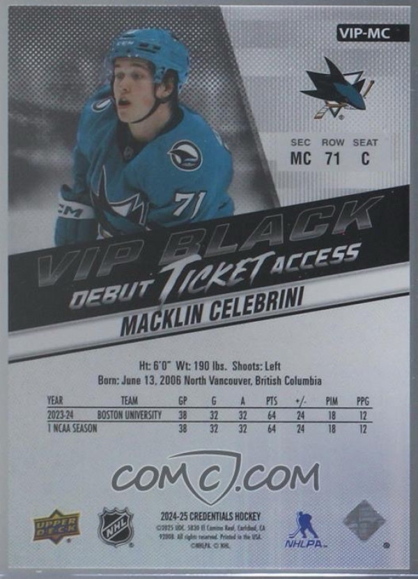 Macklin Celebrini 24-25 Credentials VIP Black Debut Ticket Access /50 Extremely Rare 🔥