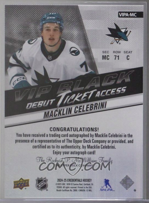 Macklin Celebrini 24-25 Credentials VIP Black Debut Ticket Access Auto /25 Extremely Rare 🔥