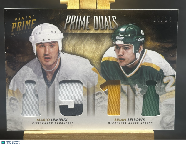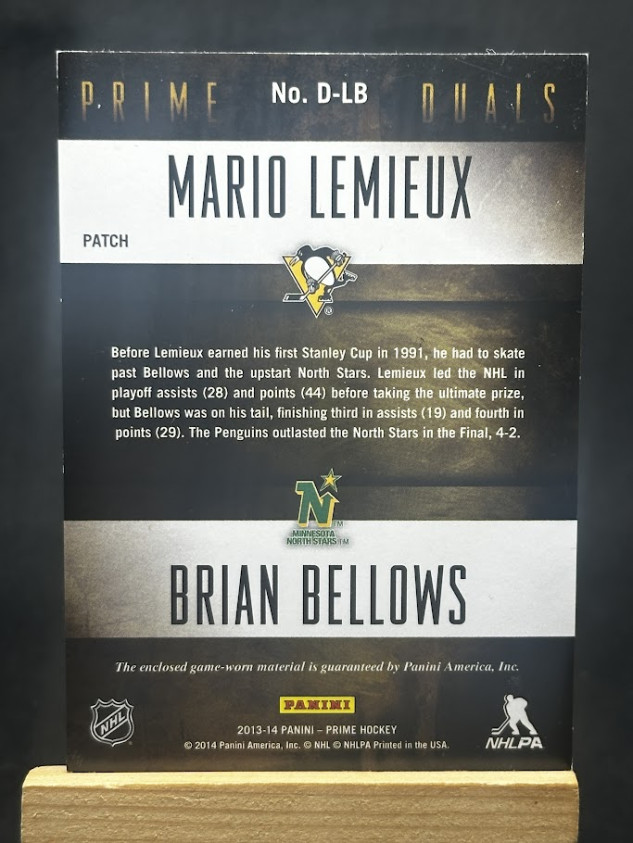 You are purchasing a Mario Lemieux Brian Bellows 2013-14 Panini Prime Duals Jersey 13/25 #D-LB .