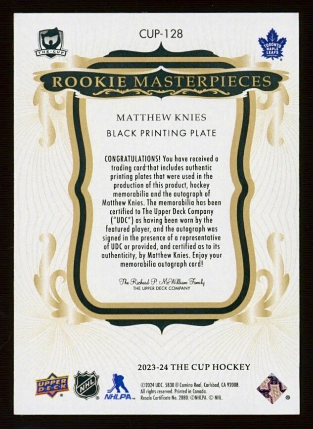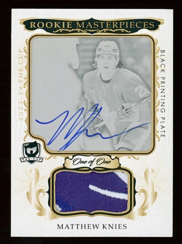 Matthew Knies 2023-24 Upper Deck The Cup - 1/1 RPA ROOKIE PATCH AUTOGRAPH PRINTING PLATE /1 BLUE INK Rookie Masterpiece Grail