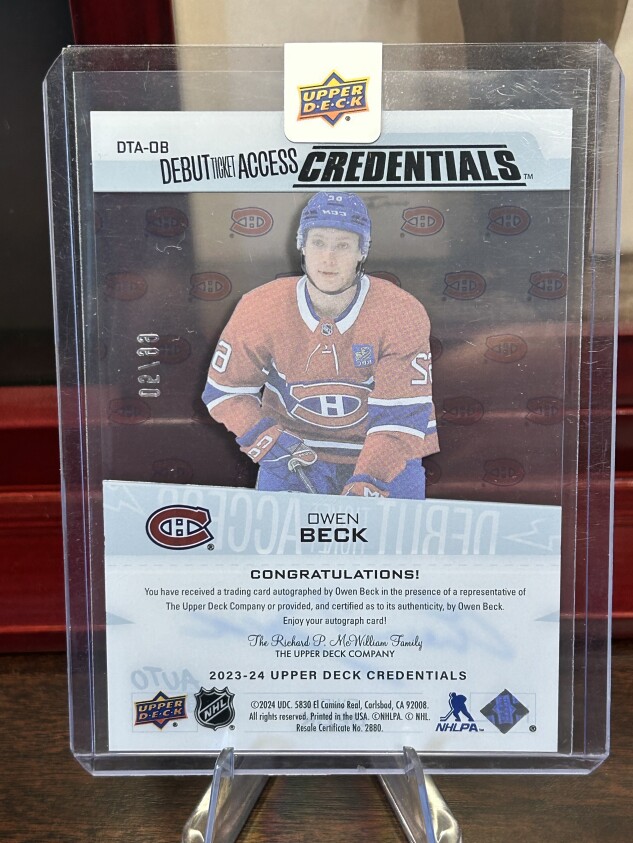 Owen Beck 2023-24 Credentials Debut Ticket Access Auto Clear Acetate 05 /99 Rookie Redemption RC