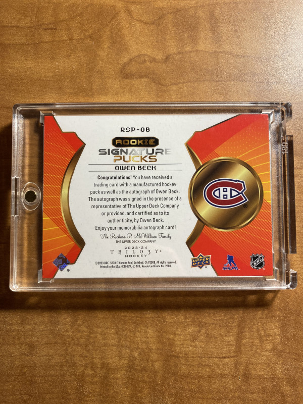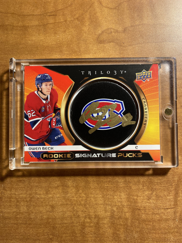 Owen Beck 2023-24 UD Trilogy Signature Pucks Rookie Gold Ink Auto /24 Canadiens