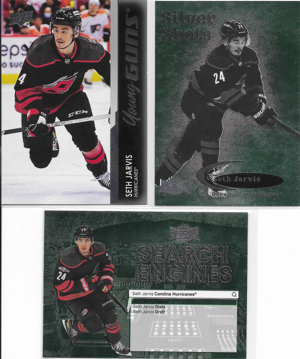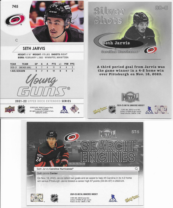 Three card, Seth Jarvis lot. 1x base Young Guns, 1x 2024-25 Metal Search Engines, 1x 2024-25 Metal Silver Shots.
