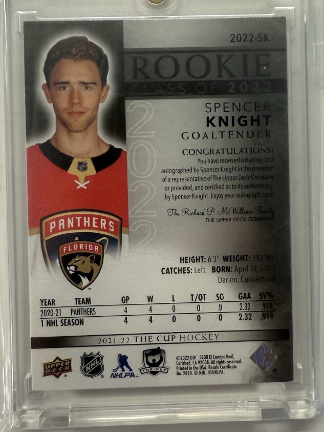 Spencer Knight The Cup Rookie Class Inscribed Auto /5