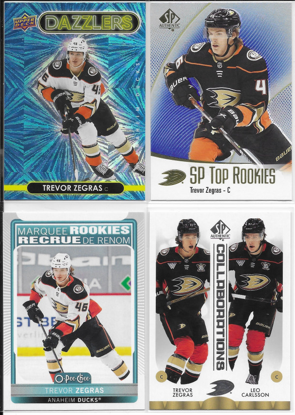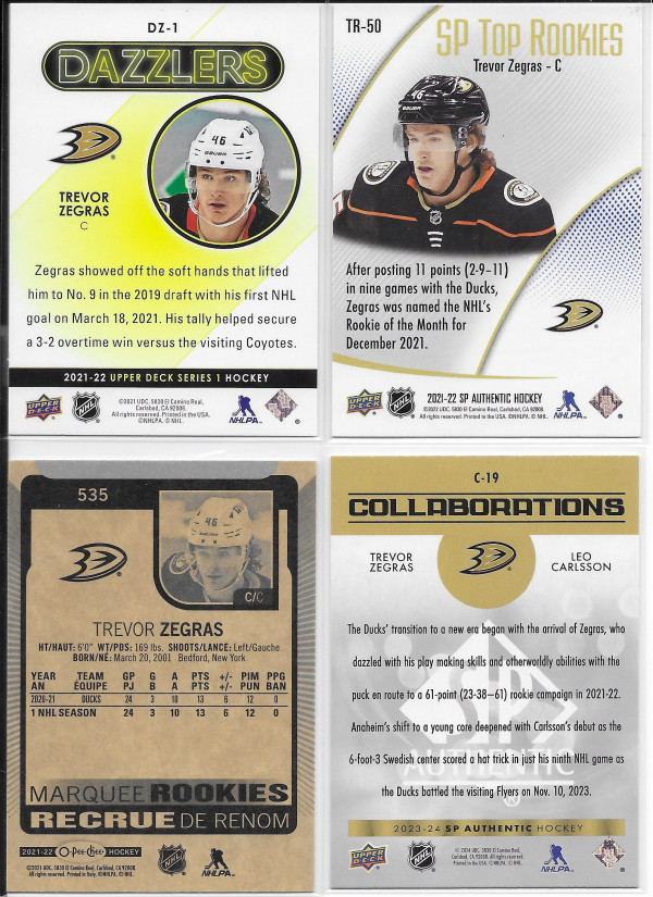 Four card lot - including three rookie year Zegras. Collaborations is Carlsson rookie year.