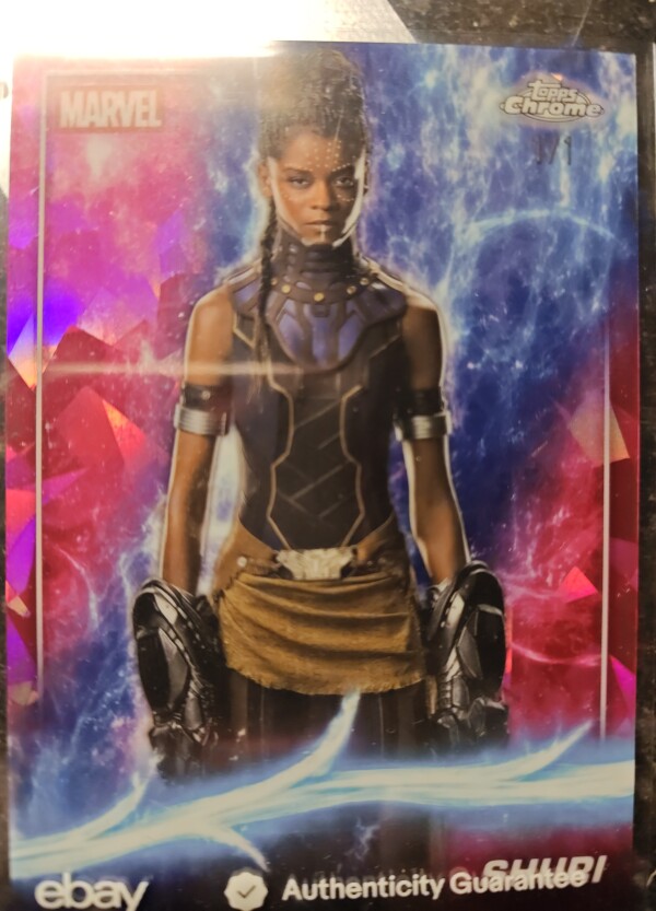 2025 Topps Chrome Marvel Studios Shuri is a 1 of 1 Padparadscha Sapphire Collectable.