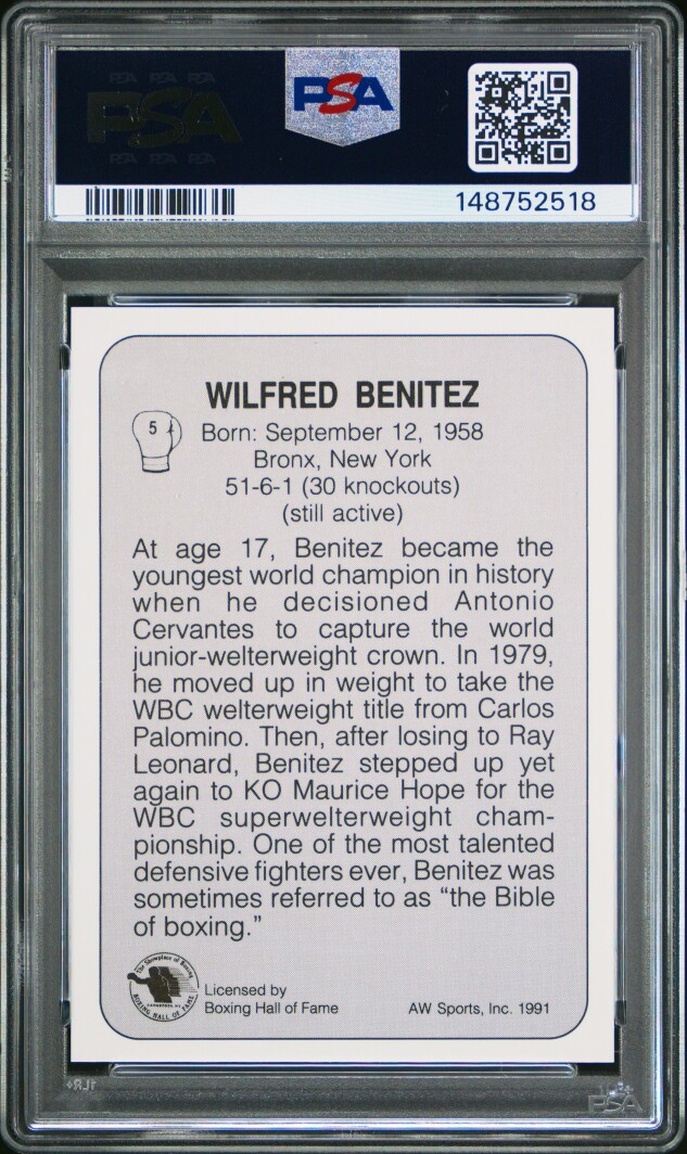 You are purchasing a 1991 Aw Sports Boxing Wilfred Benitez #5 PSA 9. Thank you for looking.