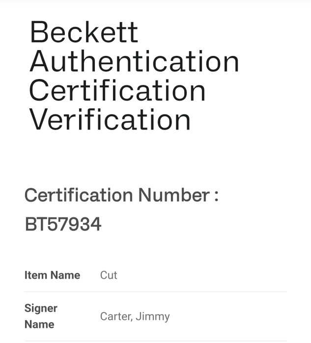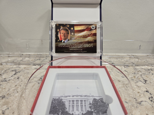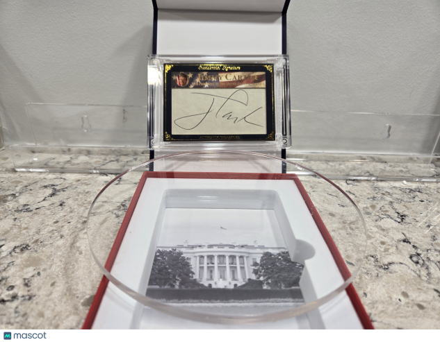 The product is a 2025 POTUS A Word From The President trading card featuring an authentic handwritten signature by Jimmy Carter. This limited edition card is part of the 2025 POTUS WHITEHOUSE RELIC set and is authenticated by Sportscard Guaranty Corporation (SGC). The card showcases a piece of US history with a vintage feel and is graded as authentic by Beckett Vintage Grading (BVG). This unique collectible is a must-have for fans of Jimmy Carter and American history.