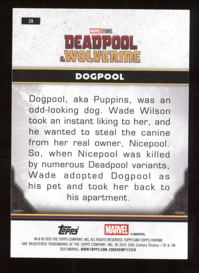 You are purchasing a 2025 Topps Chrome Marvel Studios Deadpool Dogpool 90/99 #28. You will receive the exact item in the photographs. Thank you for looking.