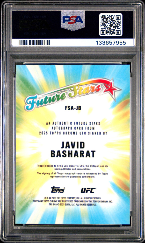 You are purchasing a 2025 Topps Chrome UFC Future Stars Autographs Javid Basharat #FSAJB Green Ref 55/99 PSA 10. You will receive the exact item in the photographs. Thank you for looking.