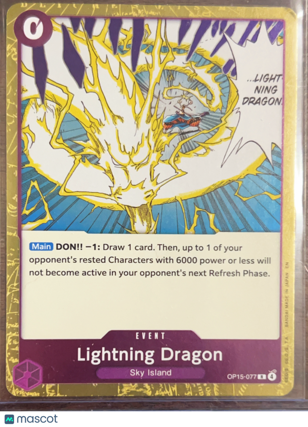 You are purchasing a One Piece Adventure on Kamis Island Lightning Dragon Holofoil Event #OP15-077. You will receive the exact item in the photographs. Thank you for looking.