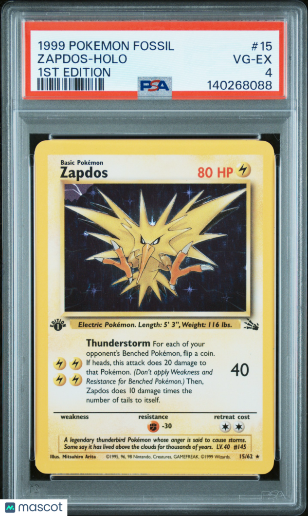 You are purchasing a 1999 Pokemon Fossil Zapdos Holo 1st Edition PSA 4 #15/62. You will receive the exact item in the photographs. Thank you for looking.