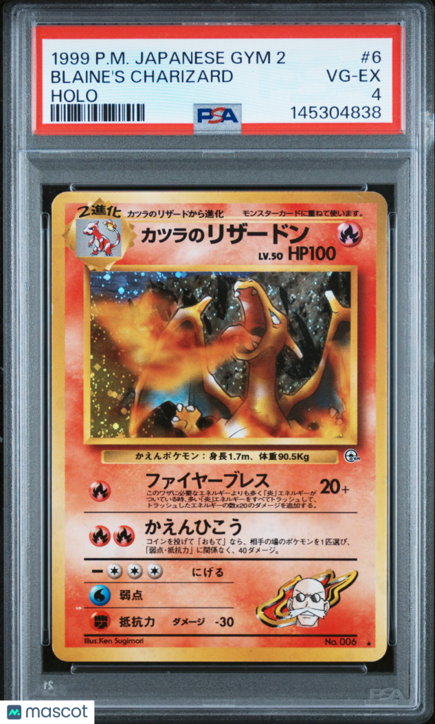 You are purchasing a 1999 Pokemon Japanese Gym 2 Blaine's Charizard Japanese Holo PSA 4 #6. You will receive the exact item in the photographs. Thank you for looking.