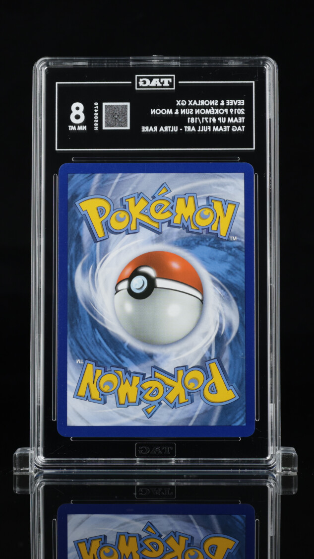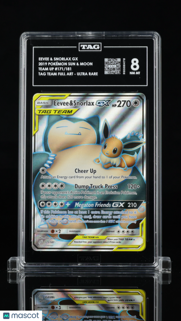 Don’t miss your chance to add this highly sought-after 2019 Pokémon Sun & Moon Eevee & Snorlax GX Tag Team Full Art card (#171/181) to your collection! Professionally graded an impressive 8 by Technical Authentication & Grading (TAG), this card is a must-have for Pokémon collectors and fans of the adorable Eevee and powerful Snorlax duo. With its official certification number H8506470, you can buy with confidence knowing you’re getting an authenticated, quality collectible.