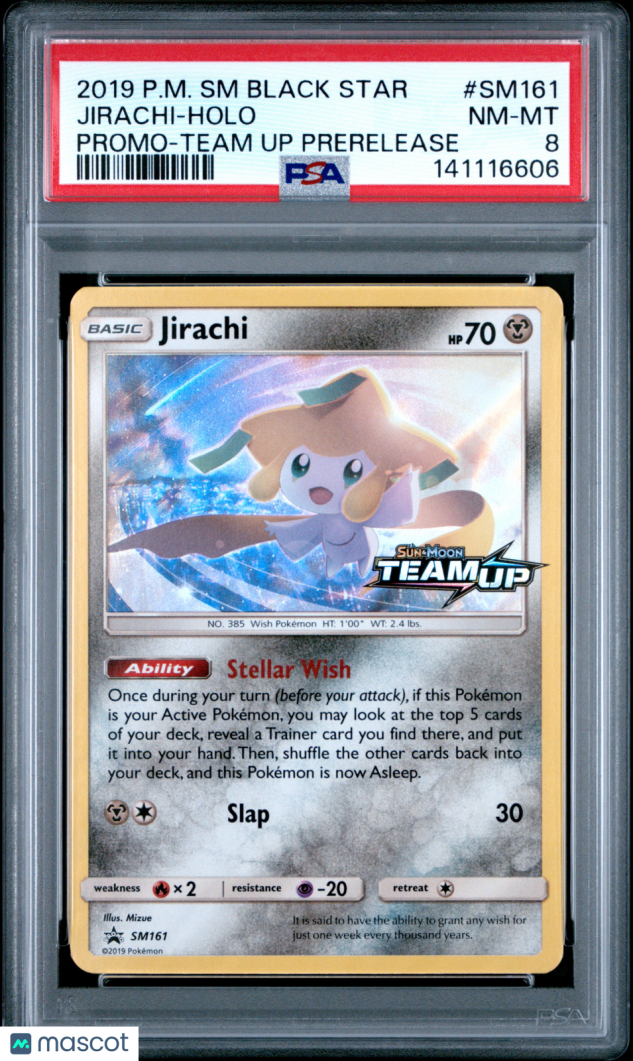 You are purchasing a 2019 Pokemon SM Black Star Promo Jirachi Holo Promo-Team Up Prerelease PSA 8 #SM161. You will receive the exact item in the photographs. Thank you for looking.
