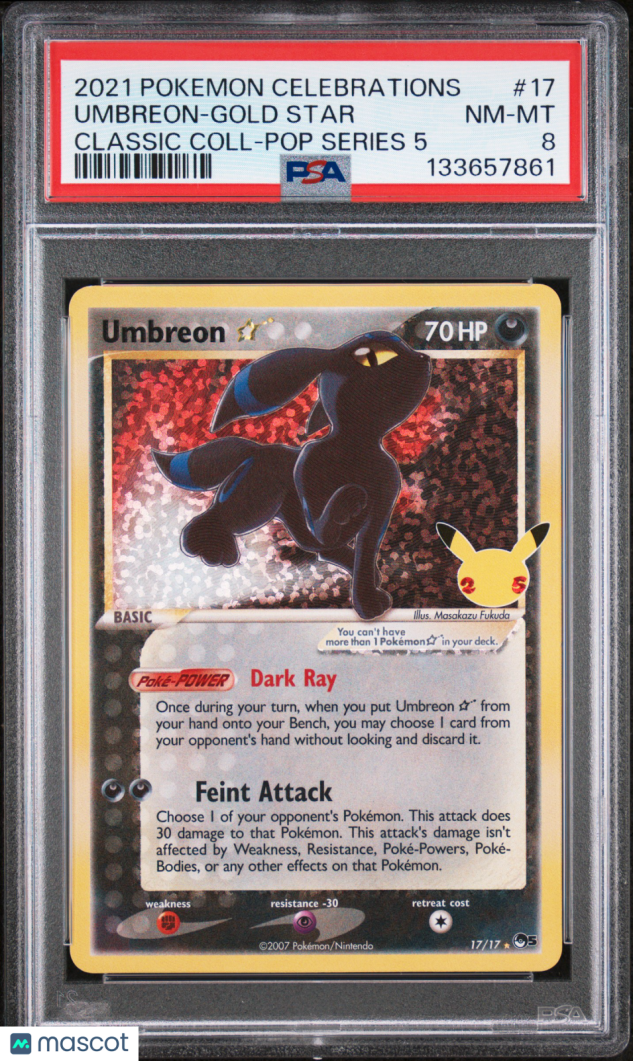 You are purchasing a 2021 Pokemon Celebrations Classic Collection Umbreon-Gold Star Classic Coll-Pop Series 5 PSA 8 #17. You will receive the exact item in the photographs. Thank you for looking.