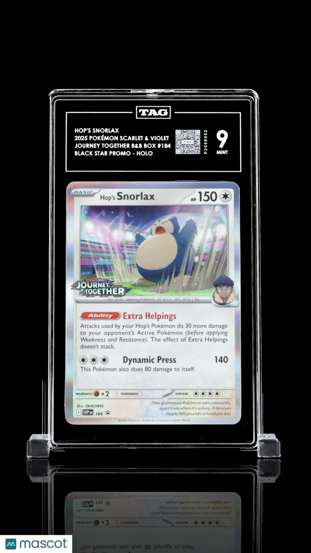 Don't miss your chance to add this highly sought-after 2025 Pokémon Scarlet & Violet Black Star Promos Hop's Snorlax (#184) to your collection! Professionally graded a strong 9 by Technical Authentication & Grading (TAG), this card is a must-have for serious Pokémon collectors and fans of the beloved Snorlax character. Secure this rare find before it's gone—perfect for display or investment!