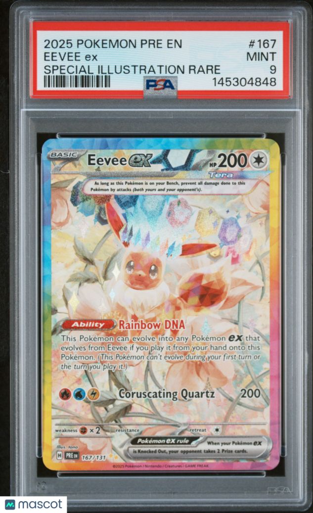 You are purchasing a 2025 Pokemon Pre EN-Prismatic Evolutions Eevee EX Special Illustration Rare PSA 9 #167. You will receive the exact item in the photographs. Thank you for looking.