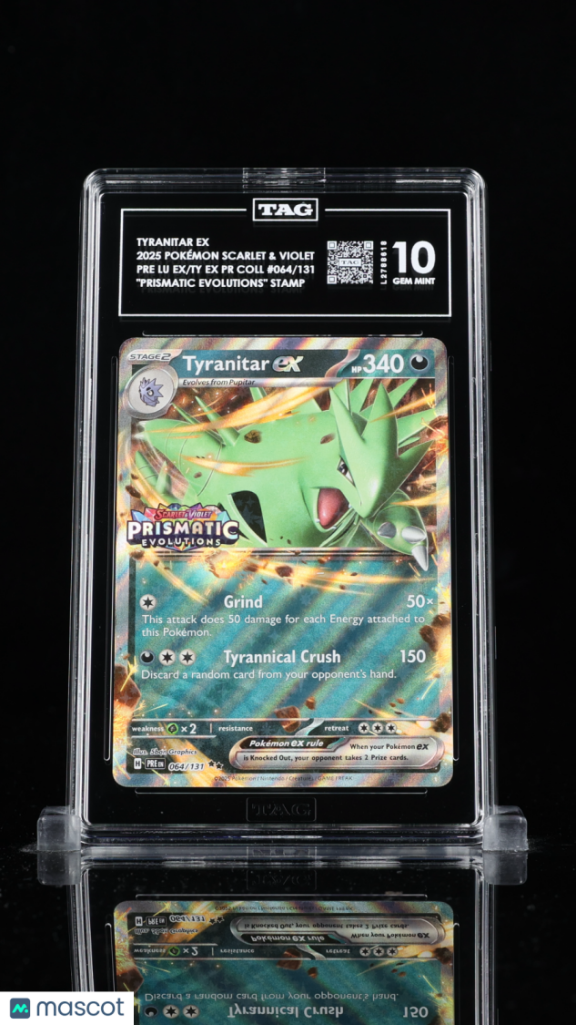 Don’t miss your chance to own this stunning 2025 Pokémon Scarlet & Violet Tyranitar ex, card number 064/131! Professionally graded a perfect 10 by Technical Authentication & Grading (TAG), this highly sought-after collectible is a must-have for any serious Pokémon card collector or fan. With its pristine condition and impressive certification, this card stands out as a true gem for your collection.