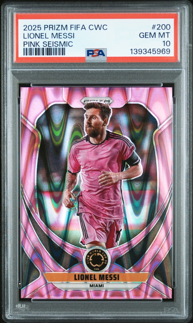 The 2025 Panini Prizm FIFA Club World Cup Pink Seismic Lionel Messi trading card is a highly coveted collectible for fans of soccer and sports trading cards. This limited edition card features Lionel Messi, one of the greatest players of all time, and is part of the popular Panini Prizm set. With a serial number of /299, this card showcases a unique design and is graded a perfect PSA 10. Perfect for collectors and fans alike, this card is a valuable addition to any sports card collection.