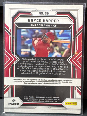 Bryce Harper Philadelphia Phillies 2022 Panini Chronicles OBSIDIAN #39
