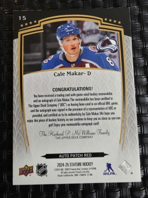 2024-25 Stature Cale Makar #15 Auto Patch Red /25