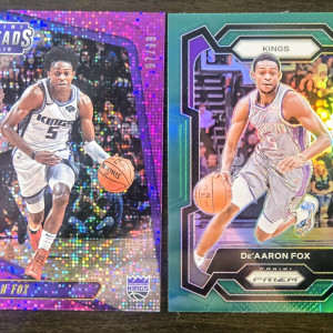 De'Aaron Fox - 2018-19 Panini Threads Purple Dazzle /99 & 2023-24 Green Prizm