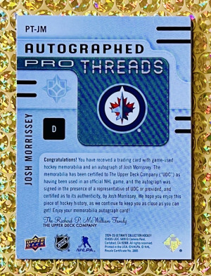 2024-25 UD Ultimate Collection #PT-JM Josh Morrissey Pro Threads 3-Color Patch Auto /49